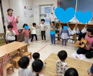 曲に合わせて身体を動かしたり、ギターの強弱を聞き分けて動いたりと、演奏の音やリズムを合わすことを楽しみました💖