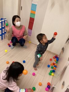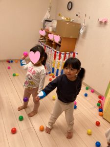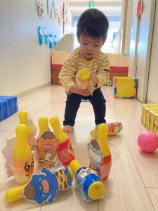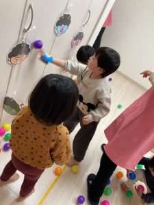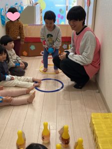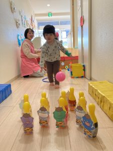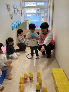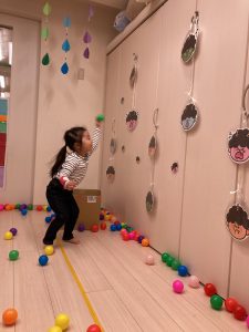 その後は、「おにはーそと!」と言いながら、鬼に向かって、カラーボールを投げたり、「鬼ボーリング」をして楽しみました。