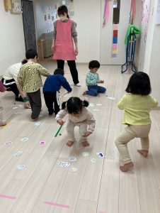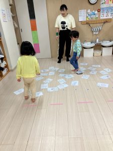 先生に「”へび!”よーいどん!」と言われたら、走って「へび」のカルタを探しに行きます。走った先のカードを見つけるのは意外と大変。最後は、「”ケーキ”と”コップ”!よーいどん!」と、2枚のカルタを探しに行きました。言われたカードをしっかり覚えて取りに行きます。みんな、カードが見つかると嬉しそうに教えてくれていました。