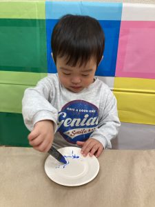 めばえぐみのお友だちは、ポスカで紙皿に色付け。