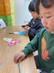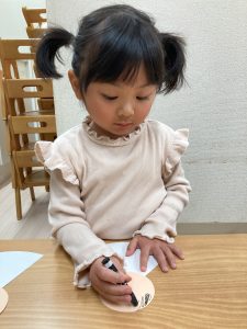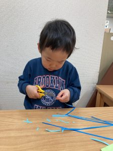 みのりぐみのお友だちは、細い棒状の紙をハサミでチョキチョキ。